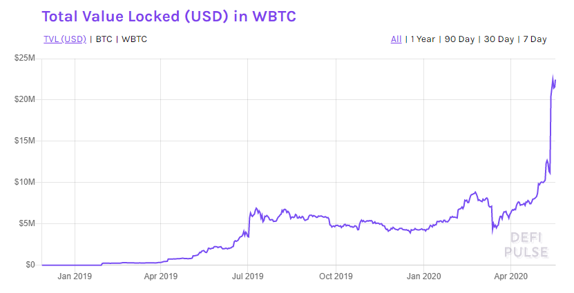 In my May 2020 Market Update, I wrote that Bitcoin was exploiting its currency network effect on Ethereum and shared this chart from DeFi Pulse showing that $25 million worth of Bitcoin had been moved onto Ethereum.