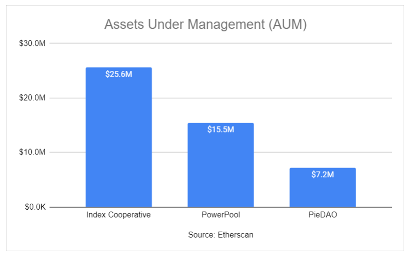 When examining the market capitalization of the respective organizations relative to AUM in their indices, Index Cooperative is nearly 80% less expensive than its closest competitor, PieDAO. At the present moment, a dollar invested in INDEX buys future potential fee revenue derived from almost 5x the AUM of PieDAO and nearly 7x that of PowerPool.