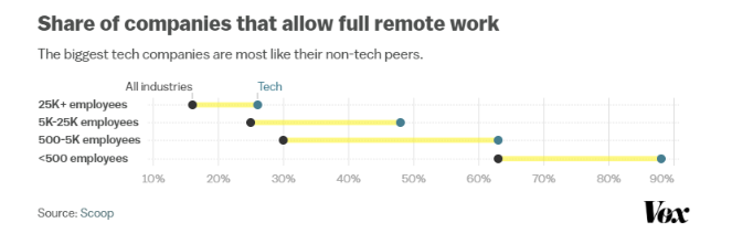 I suspect this is the reason why less than 30% of companies with more than 25k employees allow full remote work while nearly 90% of companies with less than 500 employees allow full remote work.